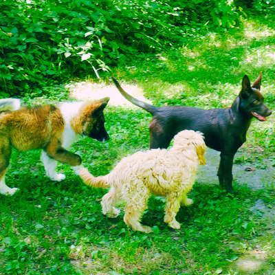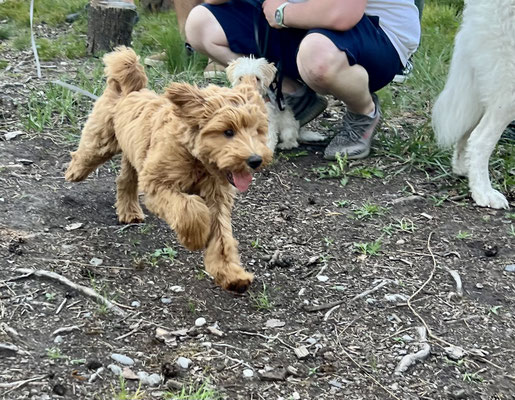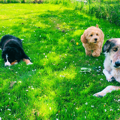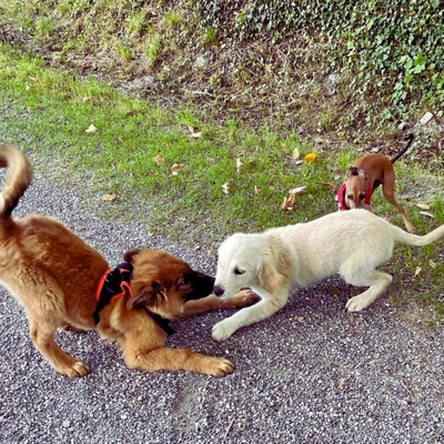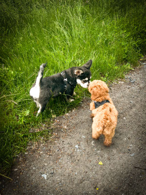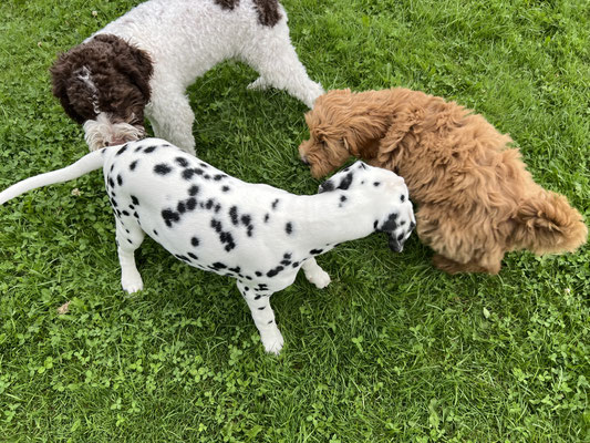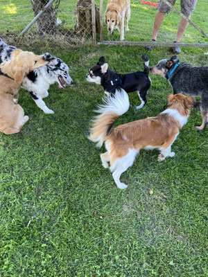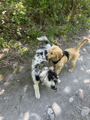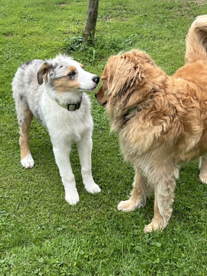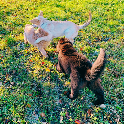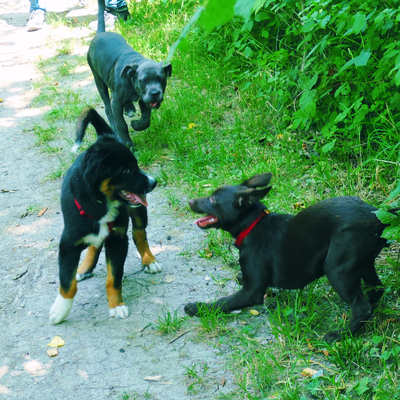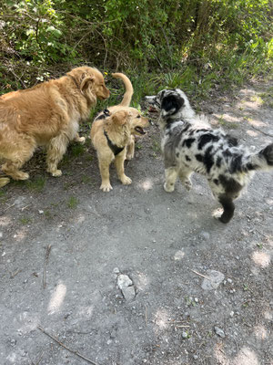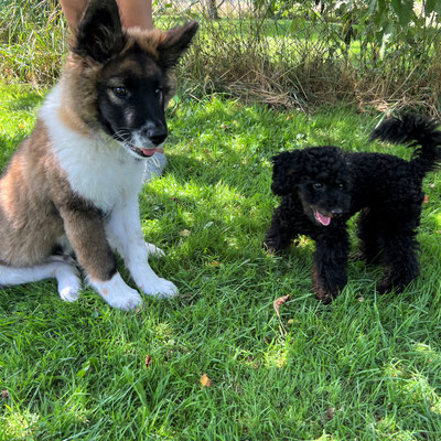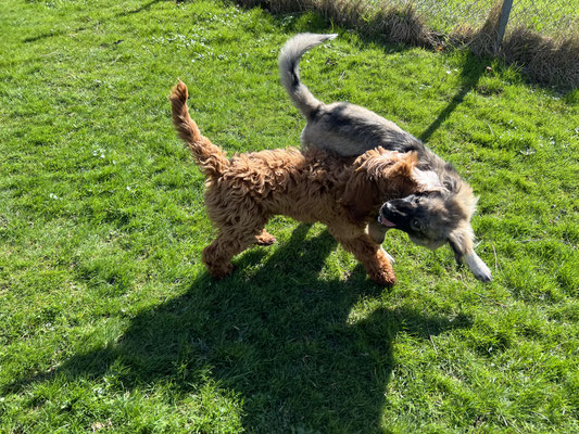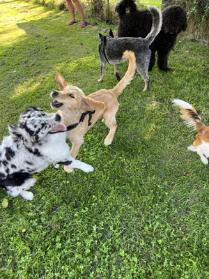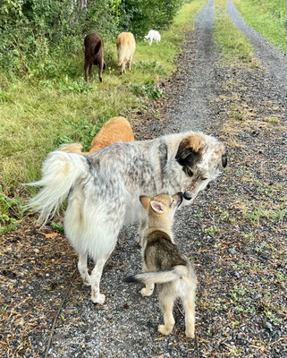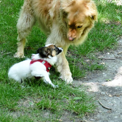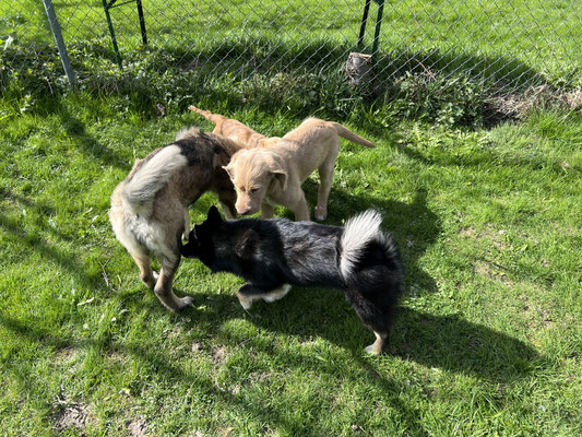 Damit sie aber keinen Unsinn lernen und nicht übertreiben, sind immer auch erwachsene, sozialkompetente Hunde an unserer Seite, die, wenn nötig, auch mal korrigieren.