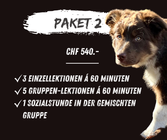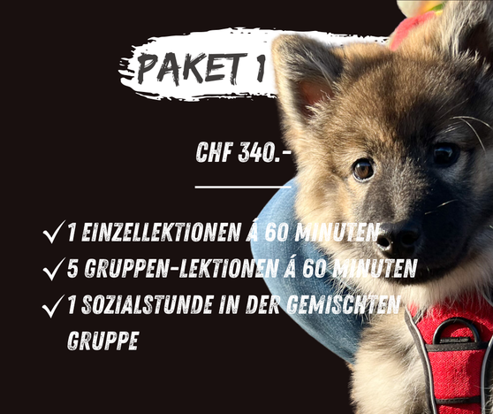 Du bist dir noch unsicher, ob du eins unserer Pakete möchtest, dann hast du die Möglichkeit eine Einzellektion plus Unterlagen über die wichtigsten Themen in der Welpenzeit für CHF 120.- zu buchen. Wenn dir unsere Art der Welpenerziehung gefällt, dann rechnen wir dir natürlich diesen Betrag bei der Buchung eines Pakets an.