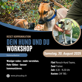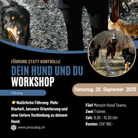Die Workshops finden je nach Thema, in Maienfeld, Igis, Chur und Umgebung statt. Der genaue Treffpunkt wird per WhatsApp bekanntgegeben. Voraussetzung für die Teilnahme ist ein 1:1-Check oder du hast schon Kurse bei Pinu'u Dog besucht.